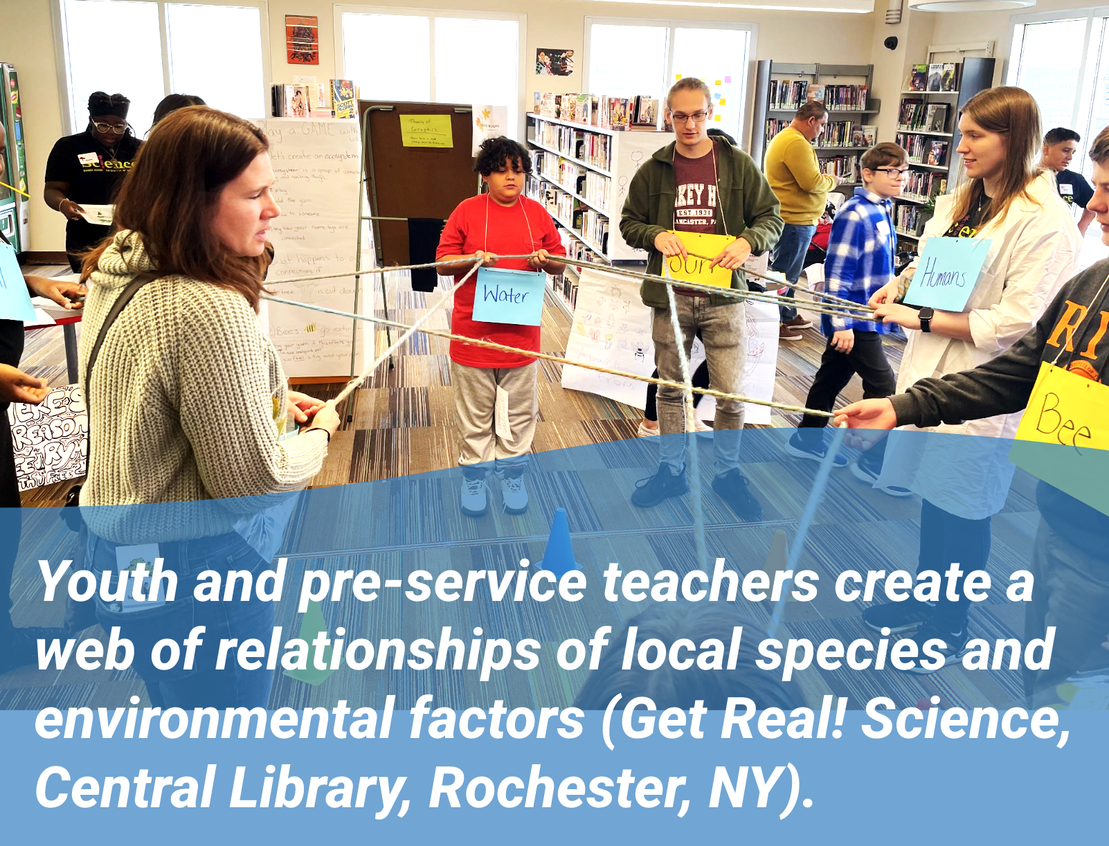 Youth and pre-service teachers create a web of relationships of local species and environmental factors (Get Real! Science, Central Library, Rochester, NY).