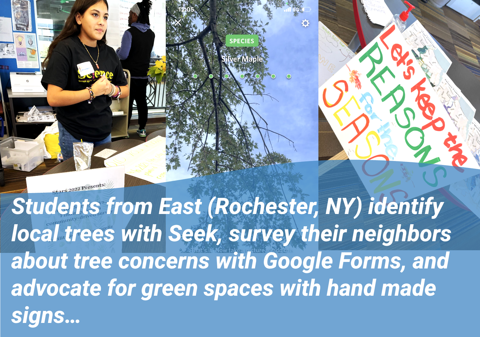 Students from East (Rochester, NY) identify local trees with Seek, survey their neighbors about tree concerns with Google Forms, and advocate for green spaces with hand made signs.