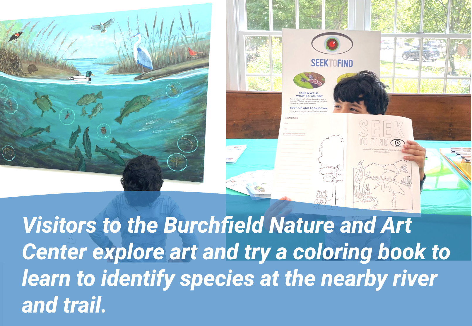 Visitors to the Burchfield Nature and Art Center explore art and try out a coloring book to learn to identify and draw species at the nearby river and trail.
